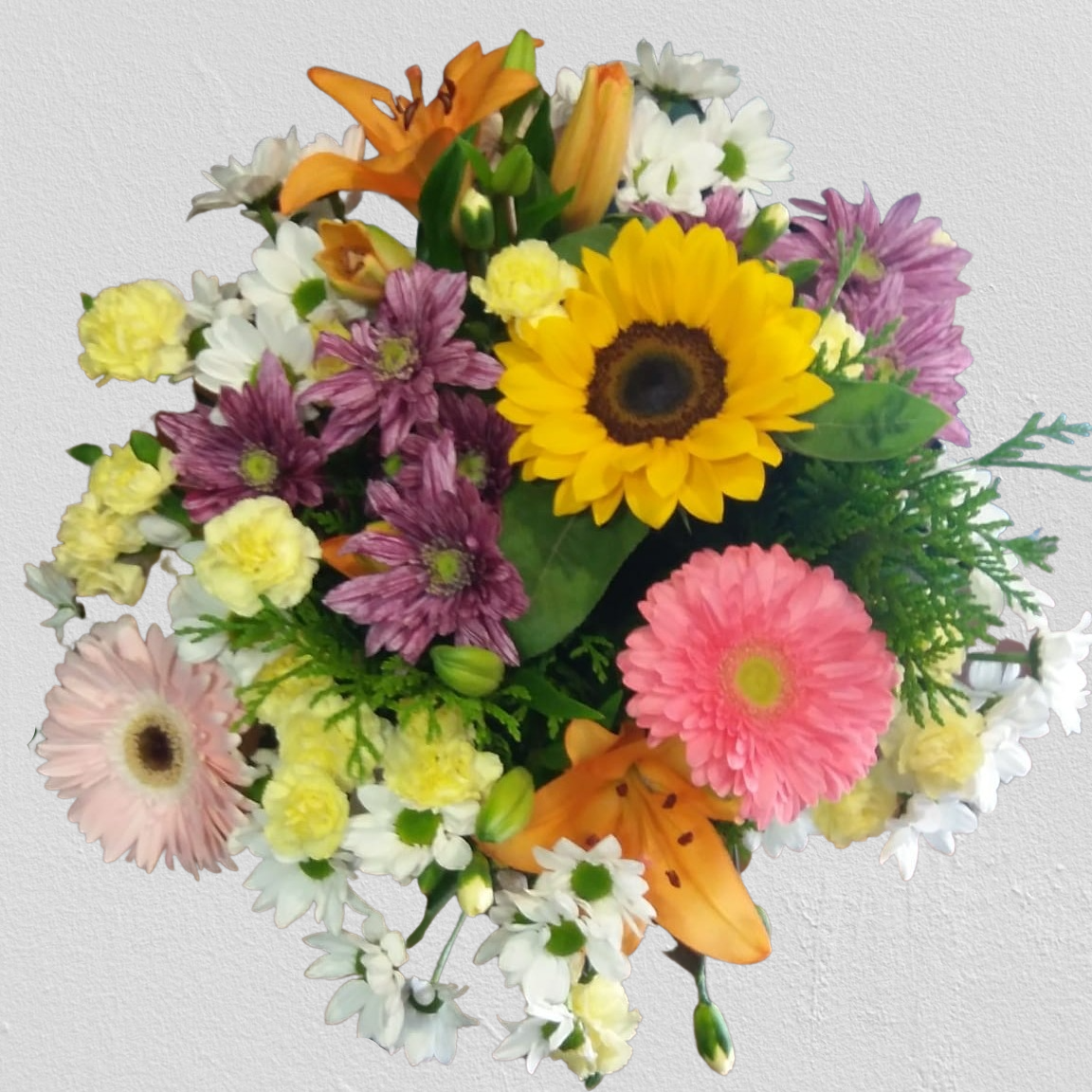 lilium, girasoles, etc. y verdes variados. Envuelto para regalo